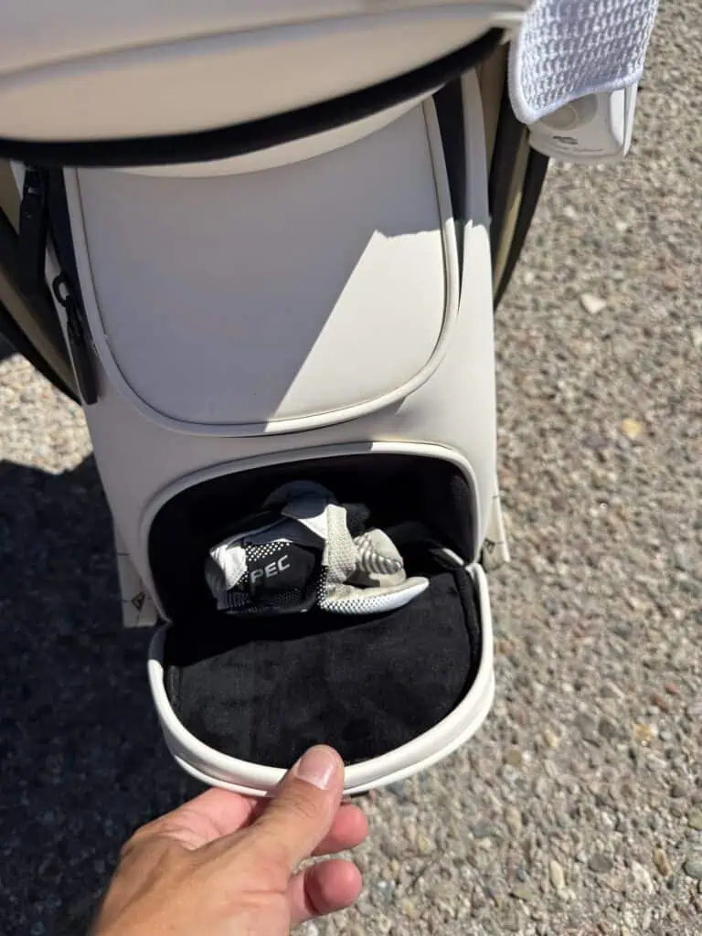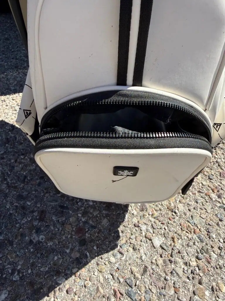 Both sides have 3 symmetrical pockets. A full length, half length and valuables pocket. These can be loaded up to even more gear making this one of largest capacity bags I’ve used. I’m impressed that even when fully loaded it still look great on the cart. Surprisingly it doesn’t bulge over and take up the whole back of the power cart. The majority of the time I used the ample spine pockets to carry everything I needed for 18 holes. It has a few hidden features that are nice too like the strap pocket in the back as well as the cart straps and sleeve for extra safety.