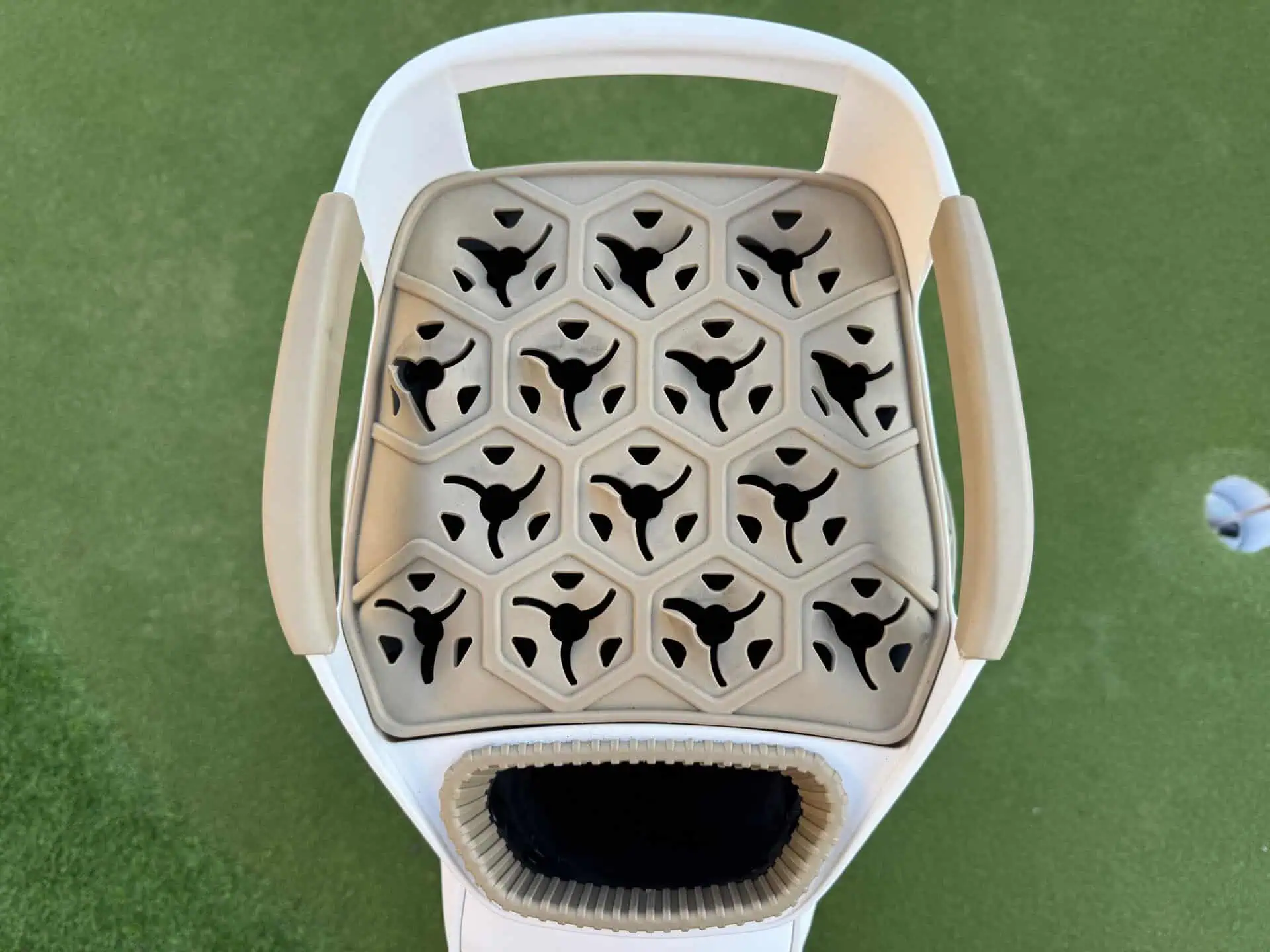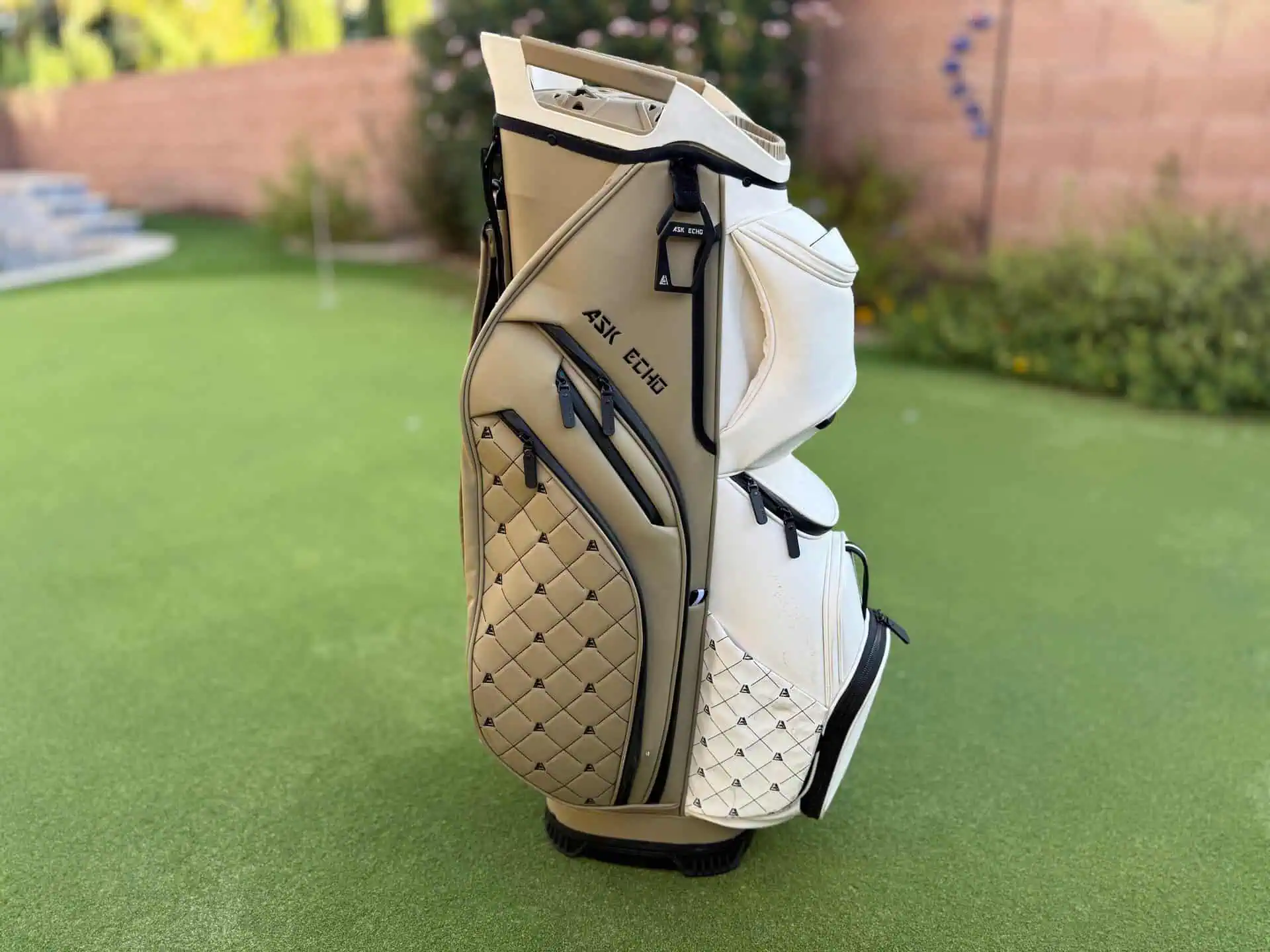 I have some really nice golf bags, but none of them turn heads the way that the Ask Echo SLC-130LE Cart Bag does. From the moment I pull it out of the truck bed to the time I put it back, this bag gets golfers talking, in the best kind of way. It is always about how nice it looks. It has kind of that “luxury purse” style with the embroidered pattern with the Ask Echo logo. The toasted almond color of brown and white also really pops on the golf cart. They offer 3 color patterns in the LE version of the SLC-130 bag and both a sure to get the oohs and aahs.