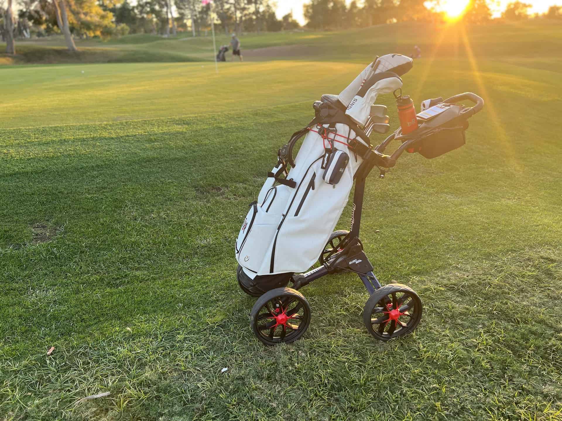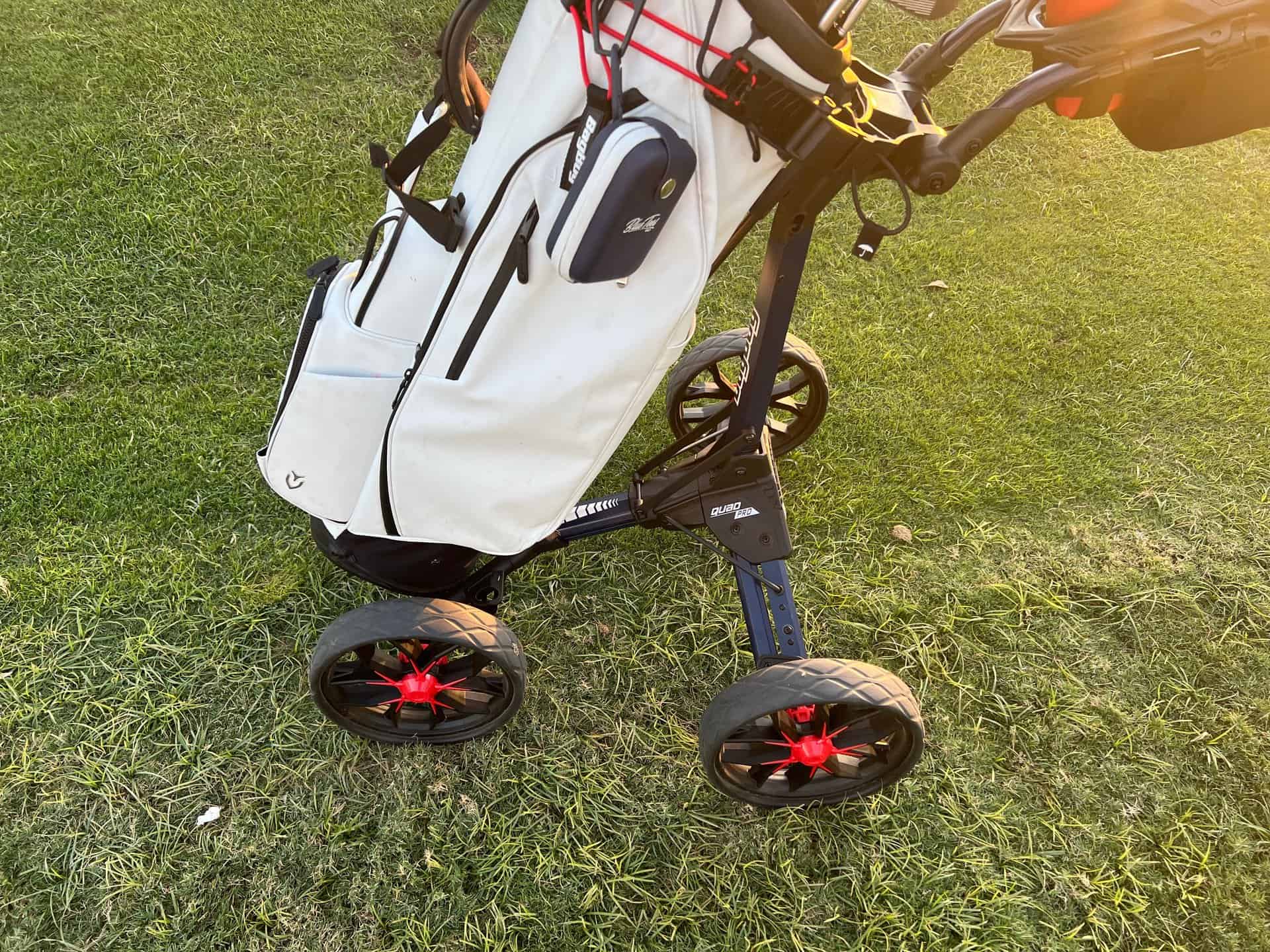 The Bag Boy Quad Pro Push Cart has 4 big wheels that are all the same size and keep your bag well off the ground. I was impressed how easily this cart rolled through thicker grass because of the tall wheels and frame. Yet it didn’t feel top heavy either, but incredibly stable across any surface. The wheels, bearings, and weight make this cart really easy to push down the fairway for all 18 holes. I really like the bungee straps which hold the bag securely on the cart with no twisting over humps and bumps.