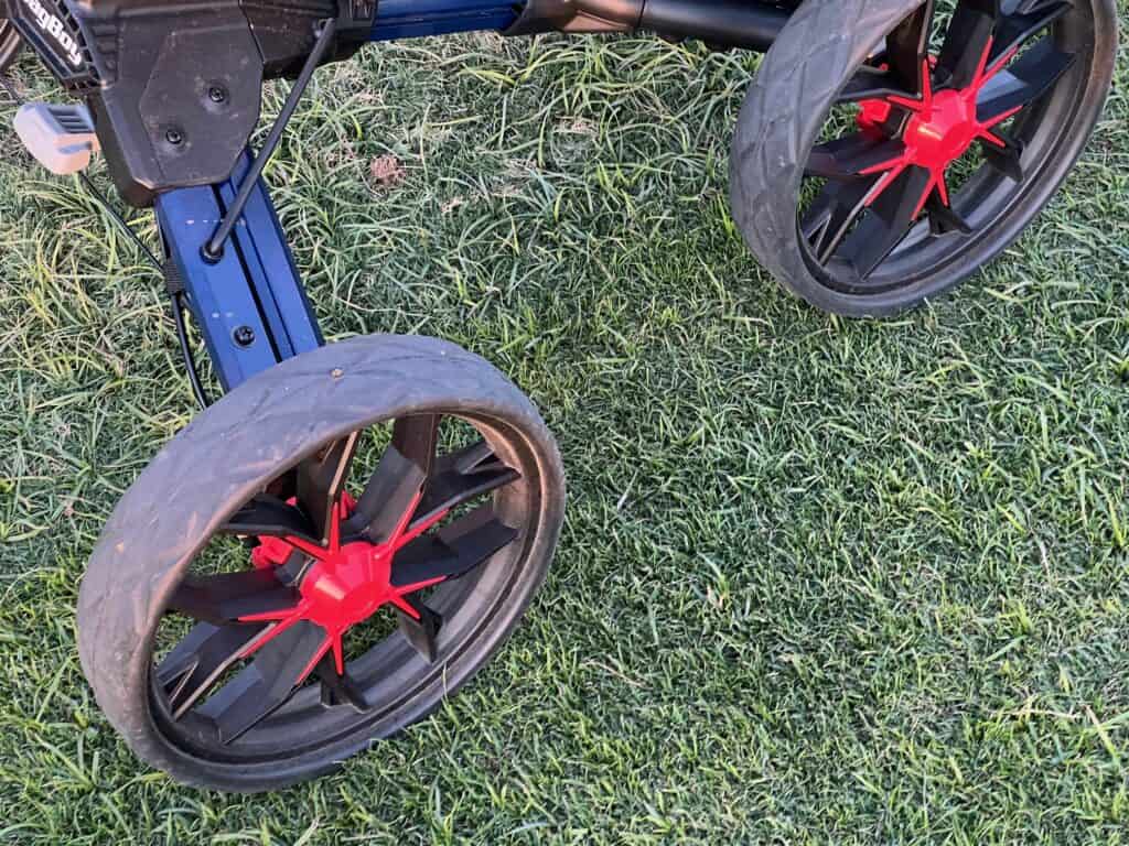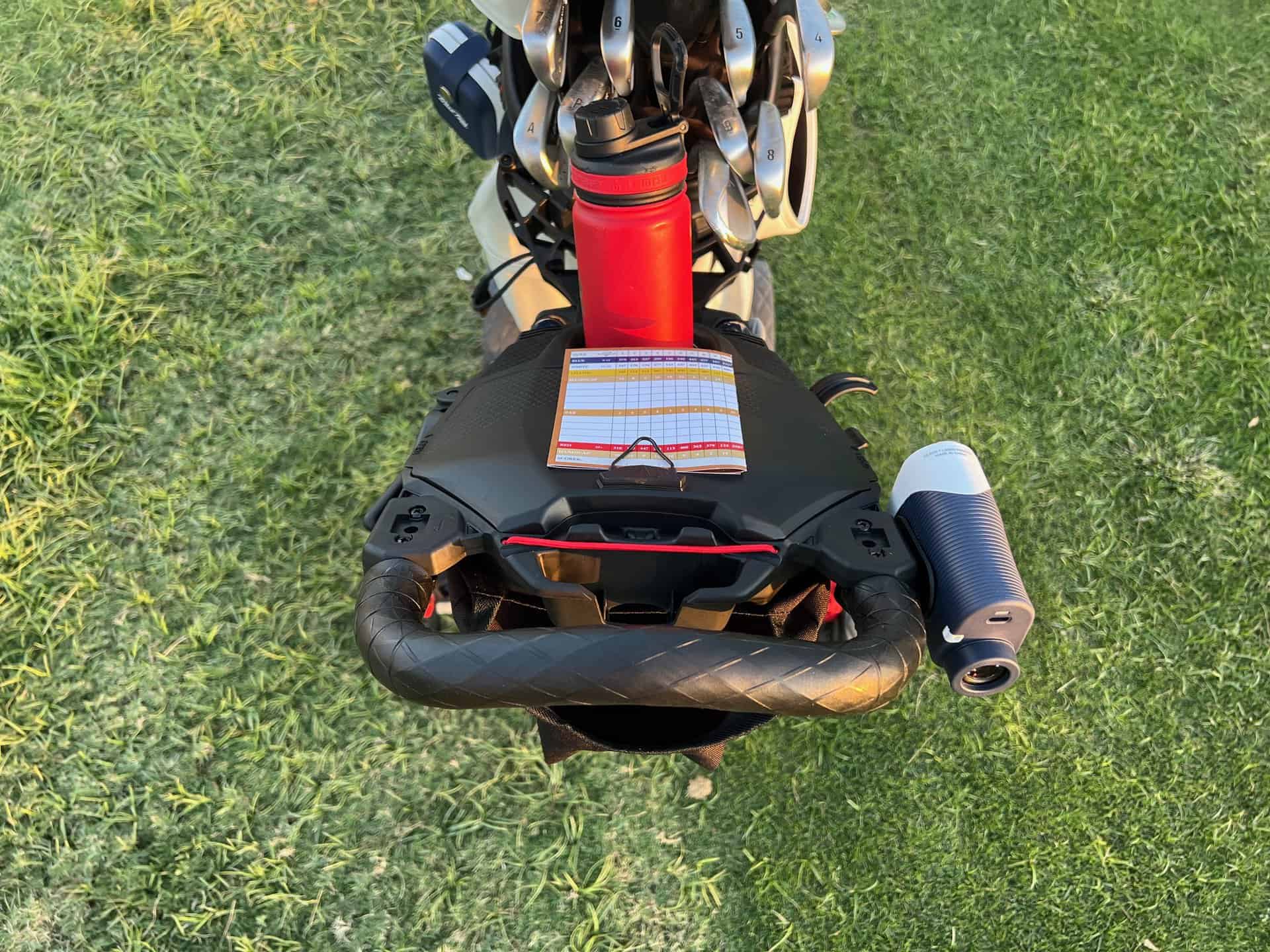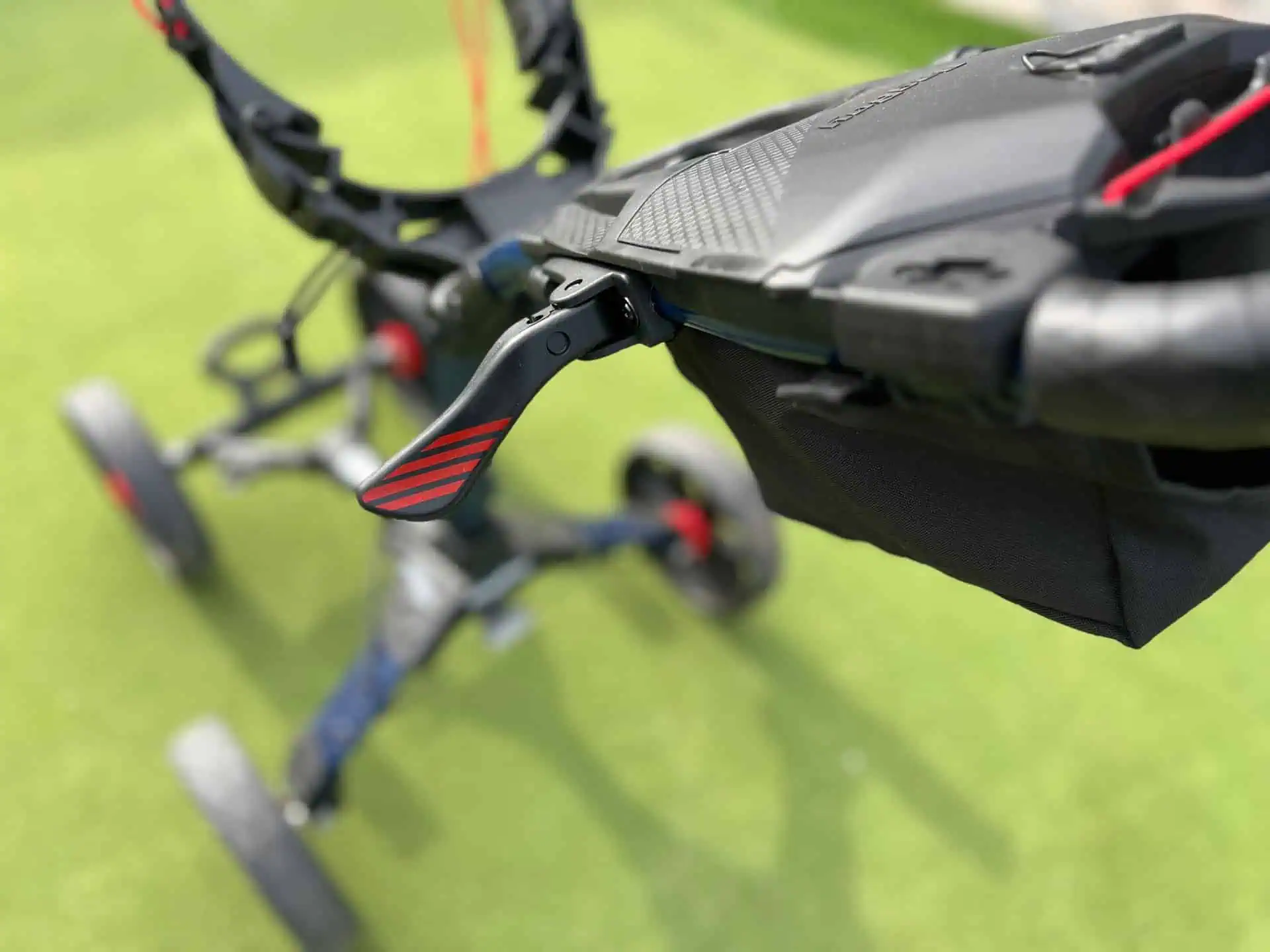 4-Wheel carts aren’t known to be compact, but Bag Boy created both a super stable cart, but also a very compact cart. The 4 wheels are all the same large size, yet when folded the cart is as small as anything else. The frame unfolded is one of the compact too and keeps the bag standing very upright. I never found myself running into things with the front end like other large carts. The more vertical bag also makes getting clubs in and out a little easier. Surprisingly it wasn’t tippy either in any direction. The folding and unfolding is 2 quick levers which make it straight forward and easy.