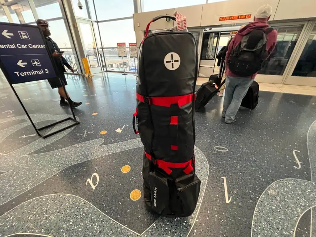 The BIG MAX Dri Lite Travel Bag has a big flat bottom with two large wheels that sits very flat when standing up and lays down nicely. The base is also molded about 1/3 the way up the back side of the bag for additional protection, sturdiness while pulling and good standing. I find the base and wheel bery important in the airport. A bag that can stay standing all by itself is vital for checking in, moving around and getting your clubs to the counter without taking out a fellow passenger or falling on all the “cattle” corral straps. The wheel are pretty big too which make it easy to navigate curbs, steps, and bumps while pulling it.