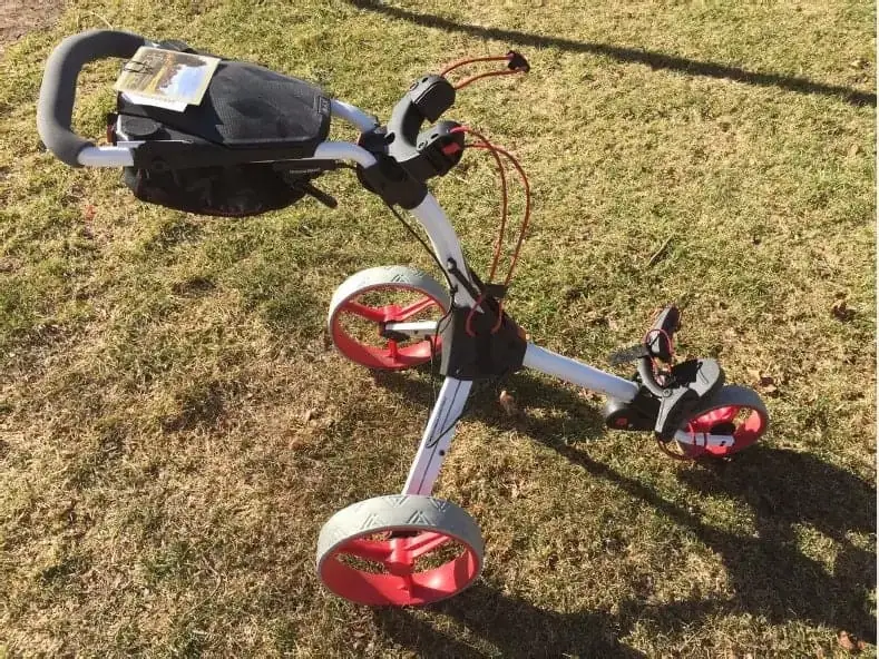 But the requirements to unfold it are simple, a push of a red button flips the front wheel straight down, and the flip of the red lever will open the rest of the cart, then lock the handle in place, strap your golf bag in and away you go.