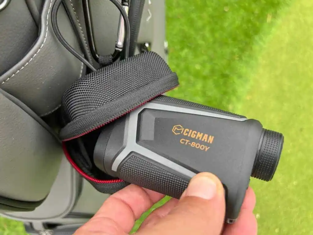 The CIGMAN CT-800Y Laser Rangefinder comes with black “hard” case which has a zipper and bungee strap to keep it secured when not in use. The buttons are pretty straight forward like most rangefinders. It goes to sleep when not in use, the large “power” button wakes it up and shoots the laser. The eye piece is adjustable so you can dial it in for your eyes. One nice feature is that it has a rechargeable battery so you just plug it into a USB and in 3 hours it is fully charged. They say it will last for 30,000 shots. Theoretically that would last over 300 rounds of golf. So this makes it even more economical. It comes with a magnetic strap so you can mount it to the arm of the cart for great usage, or take the strap off and throw it in the glove-box of your push cart with out it sticking to something.