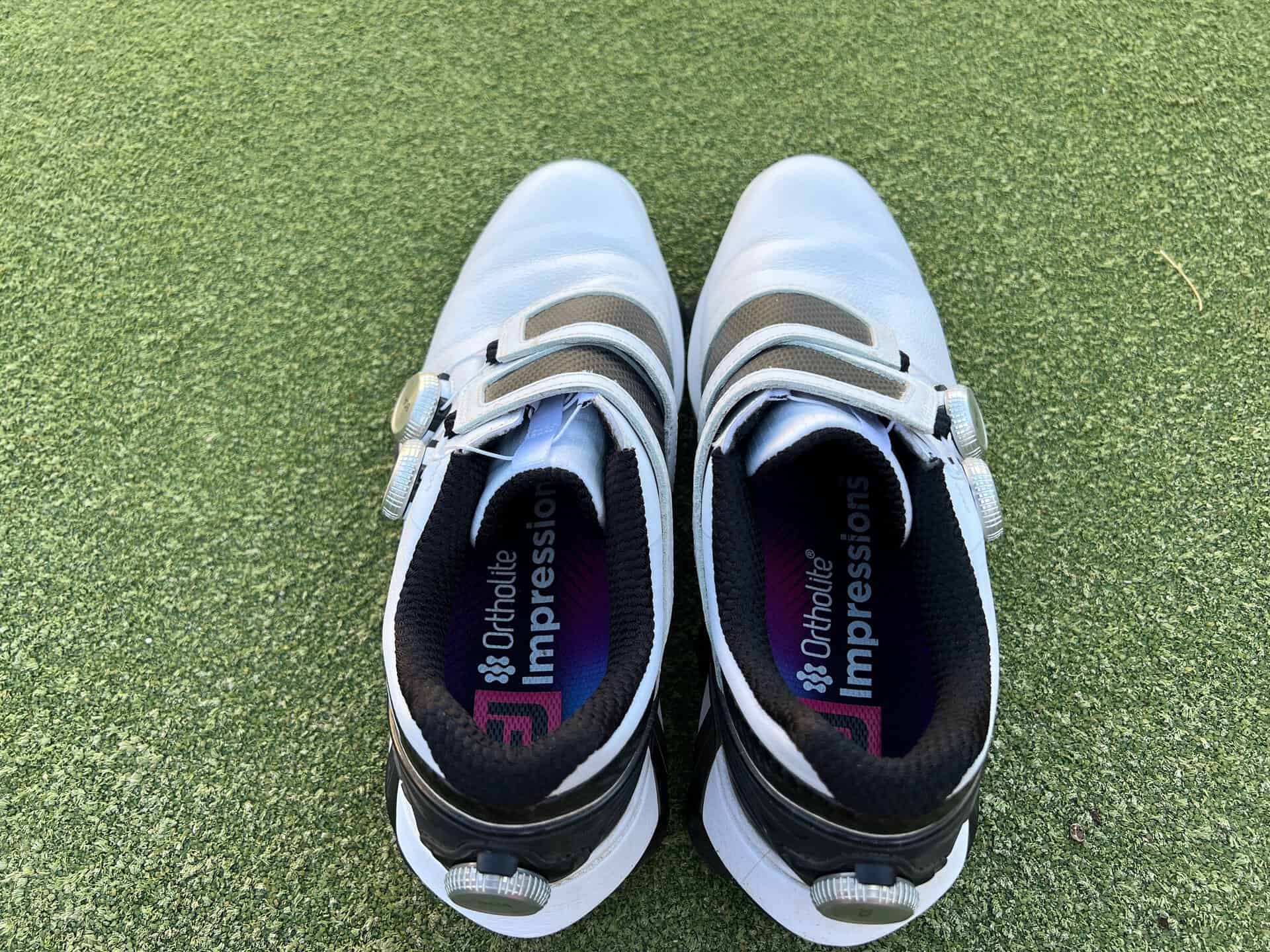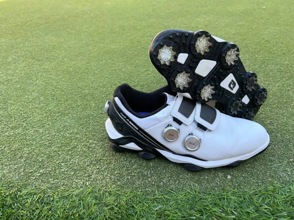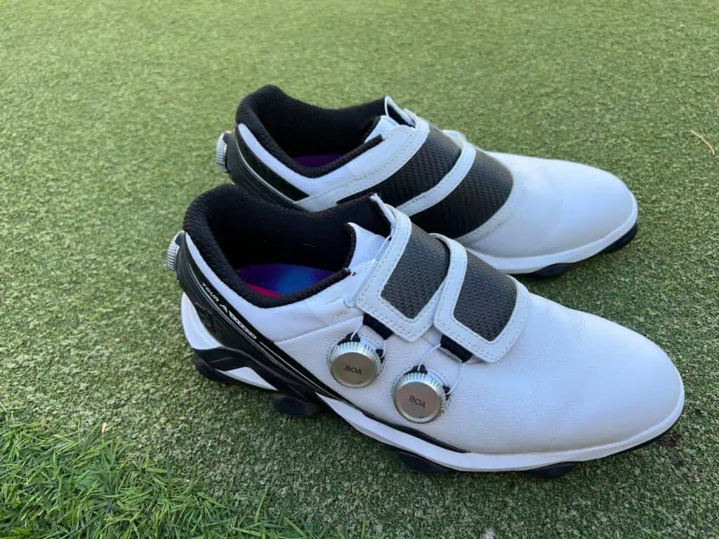 How many BOAs is too many? Not 3. BOA offers a precise fit with their micro adjustments with each click of the BOA disc. The lace system does not stretch like traditional laces so that even a single BOA can lock in the fit and keep it all 18 holes. However if you are looking to increase that precise fit, you can add BOAs to dial in specific areas differently. Instead of a constant tension of the BOA fit system, you can adjust the mid foot more than the ankle and different from the heel. The FootJoy Tour Alpha Carbon Triple BOA fit system gives you the most precise fit of any golf shoe you can buy. I liked the ability to increase or decrease tension in different areas of the shoe with the ease of BOA. Triple BOA is still easier and faster than traditional laces for both on and off.