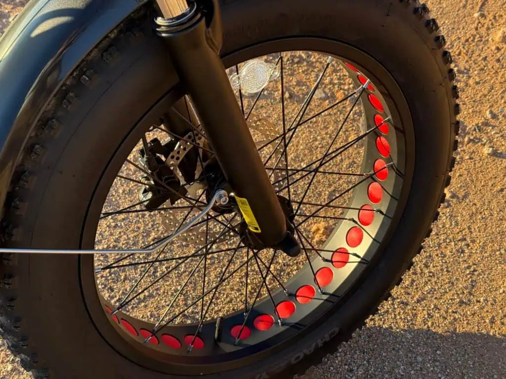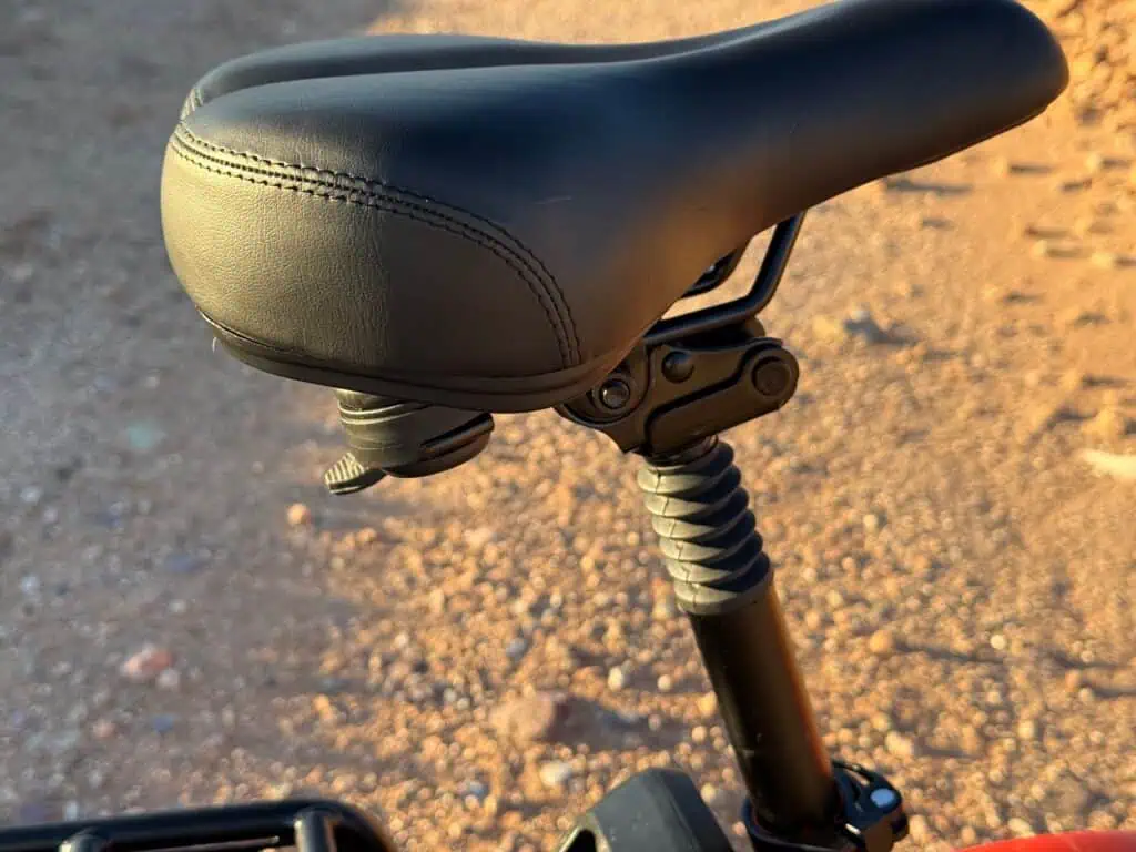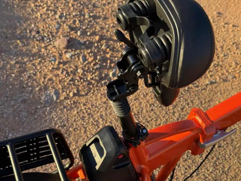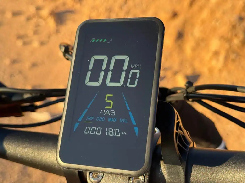 The Heybike Mars 2.0 Ebike has a very comfortable and tall ride. I like that you don’t feel hunched over riding this bike with the tall handlebar stem and matching seat post. The 4″ by 20″ wheel make it easy to navigate any terrain street or trail. The front shocks absorb any bumps in the front. It is compact, but feels “big” when riding it. The handle bars have everything easily accessible for speed, scooter, brakes, lights, horn and display. The seat is soft with the addition stem shock and the pedals feel natural while riding.