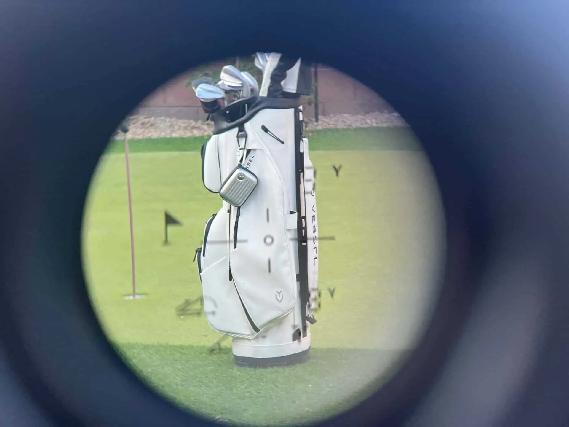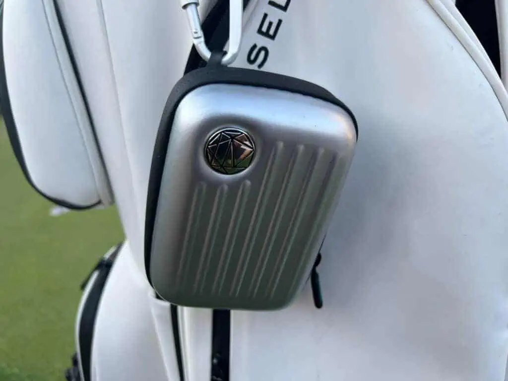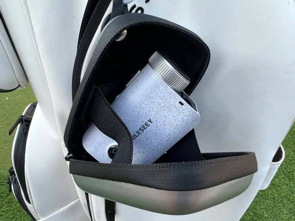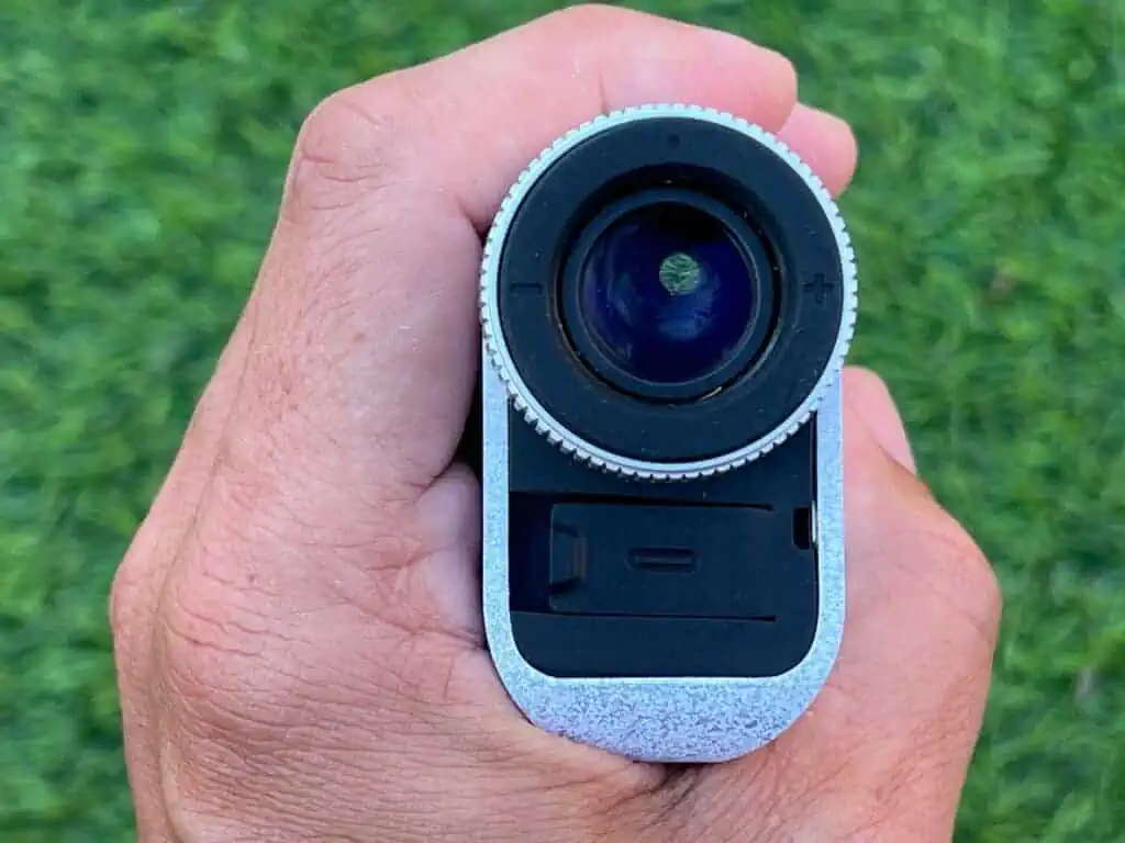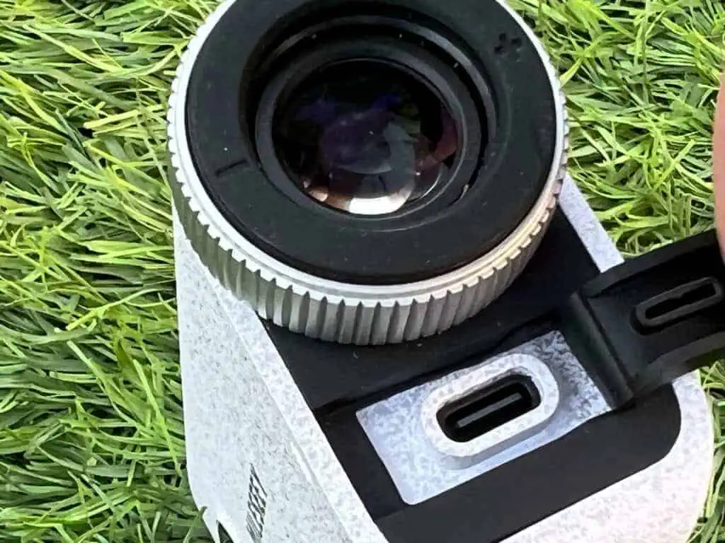 The Mileseey PF1 Laser Rangefinder comes with grey waterproof “hard” case which has a zipper to keep it secured when not in use. The buttons are pretty straight forward like most rangefinders. It goes to sleep when not in use, the large “play” button wakes it up and shoots the laser. The eye piece is adjustable so you can dial it in for your eyes. One nice feature is that it has a rechargeable battery so you just plug it into a USB-C and in no time it is fully charged. While it doesn’t use the CR-2 battieres like so many lasers, the battery life is just as long. I haven’t even touched the full battery after 4 rounds of golf. I’m guessing it could make it all season like so many other laser rangefinders do. It doesn’t have a magnet which has kind of become standard on lasers now, but there a multiple $20 magntic straps out there you can buy to stick it to the arm of a cart.