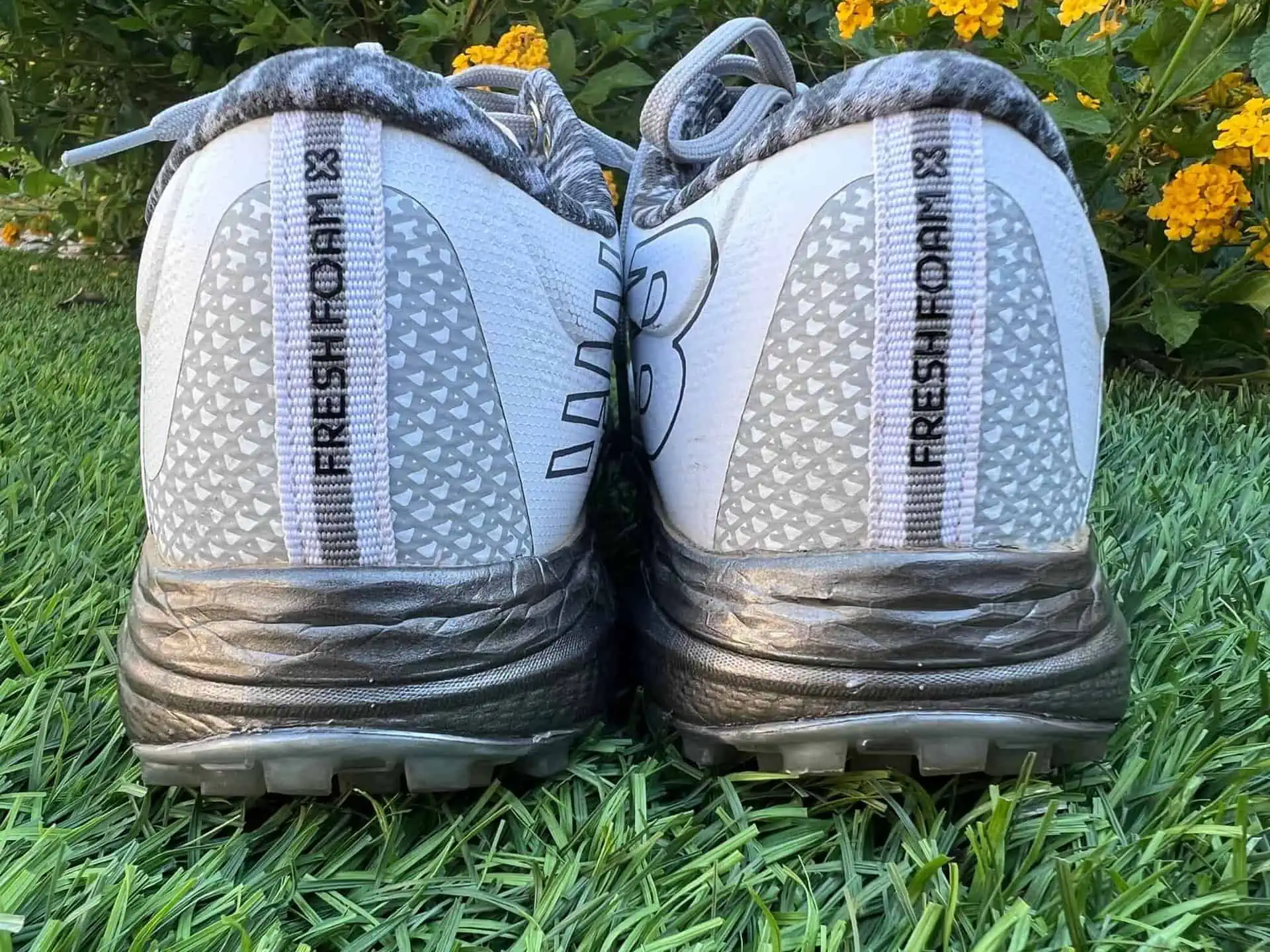 The New Balance Fresh Foam X Defender SL Shoes have a TPU outsole that combines and exoskeleton design with numerous square “lugs”. It flexes really nicely on every step. The TPU however has a little more “plastic” feel to it which means this is an audible click when you walk on tile or cart paths. They grip the turf amazingly well, but have just a slight slickness to them on tile floors. They seem to soften up a bit as I wear them more too. I think it really depends on your usage plan. If you mostly wear them on the course, they will be amazing. I didn’t feel the need to take them off after golfing, but if the flooring was slick I needed to be cautious.