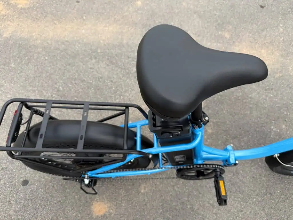 While I found the lightweight nature of the Qronge Mirage Ebike really made it nice for daily use, but I was surprised at how stable it was even with a golf bag attachment. The Divinick Golf Bag Rack rode nicely and didn’t have any balance issues on the course. The 3″ wide tires are slightly narrower than some, but still didn’t cut into the turf. It had plenty of battery power and with the 1000w hub motor it rode smoothly around the course. It is rated for a 350lbs payload so a rider and golf bag were no problem. If you are packing this in your trunk or truck bed, the lightweight and folding features come in handy.