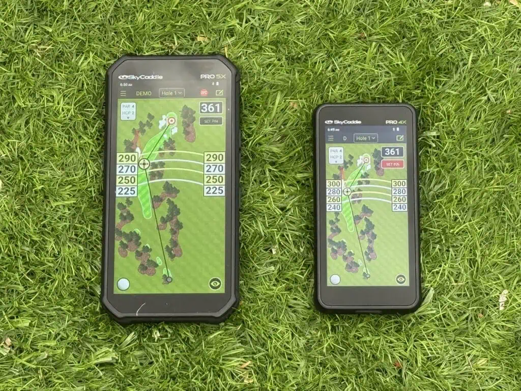 In the same way cell-phones comes in different sizes, so SkyCaddie offers two different handheld golf GPS units the PRO 5X and PRO 4X. As you can see them side by side above, it really depends on preference and price. Everything about them is exactly the same so it comes down to choice. If you keep it in your pocket, the PRO 4X is more compact, if your eyesight isn’t a perfect 20/20 then the PRO 5X. It is a $50 difference between the two so that also might be a factor. If you have a tendency to drop things than the PRO 4X is better since you can grip it tighter.