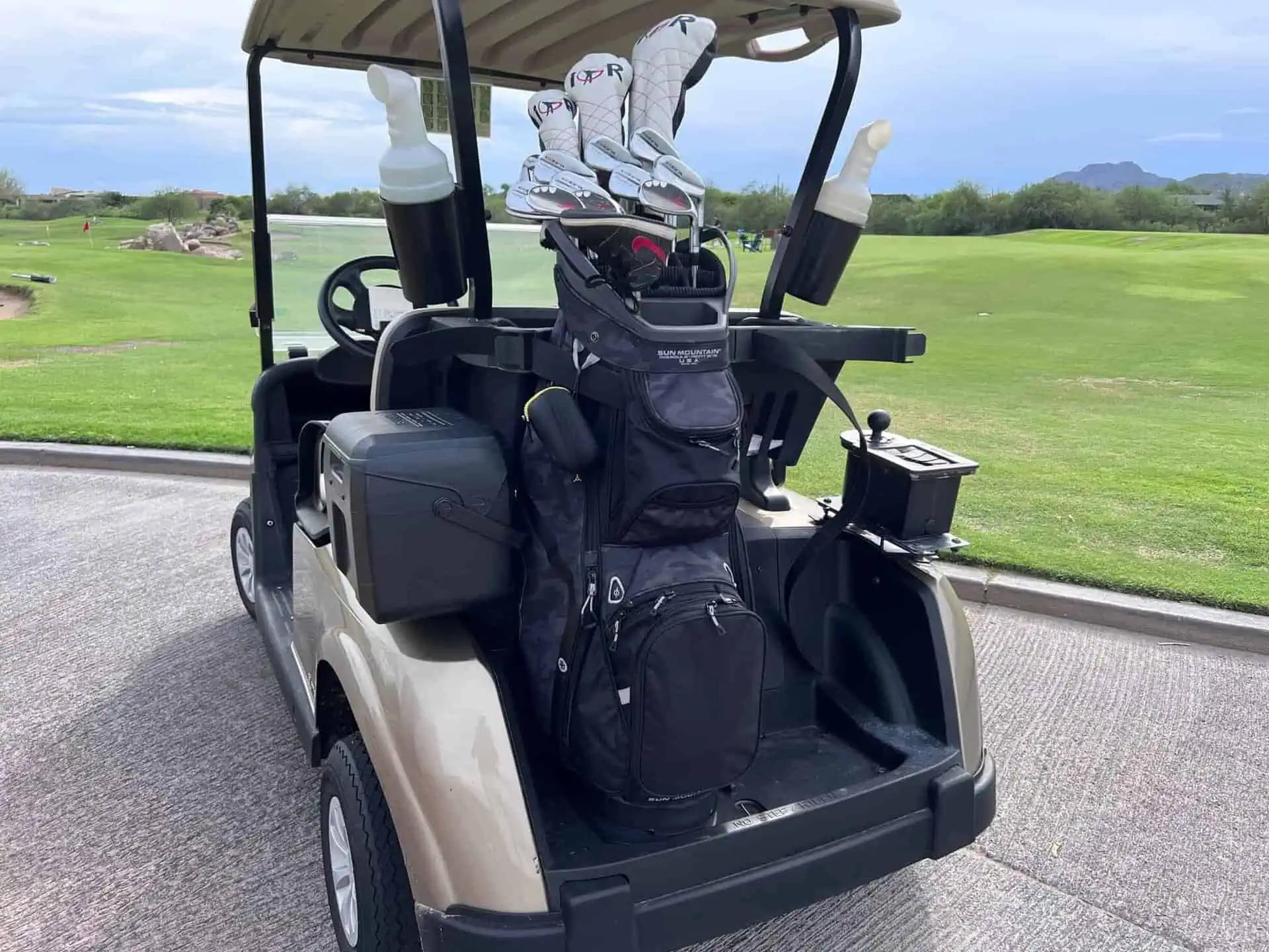The Sun Mountain Maverick Cart Bag has some “hidden” features which make it extra durable and functional on a cart. The pass through strap pockets make it sturdy on the cart without crushing the top of the bag. The straps go through the side pockets as well as the spine pocket so you can be rider or passengers and have you bag well secured to the cart. Even if you hit big bumps the bag can’t slide off. The rubber bumper pads on back of the bag also protect it from “cart rub” against the basket. They also serve as stabilizers so that bag doesn’t move or twist on the back of the cart. It also has a couple loops and clips for things like a towel, rangefinder, umbrella, water bottle, etc. that can be attached to the outside of the bag.