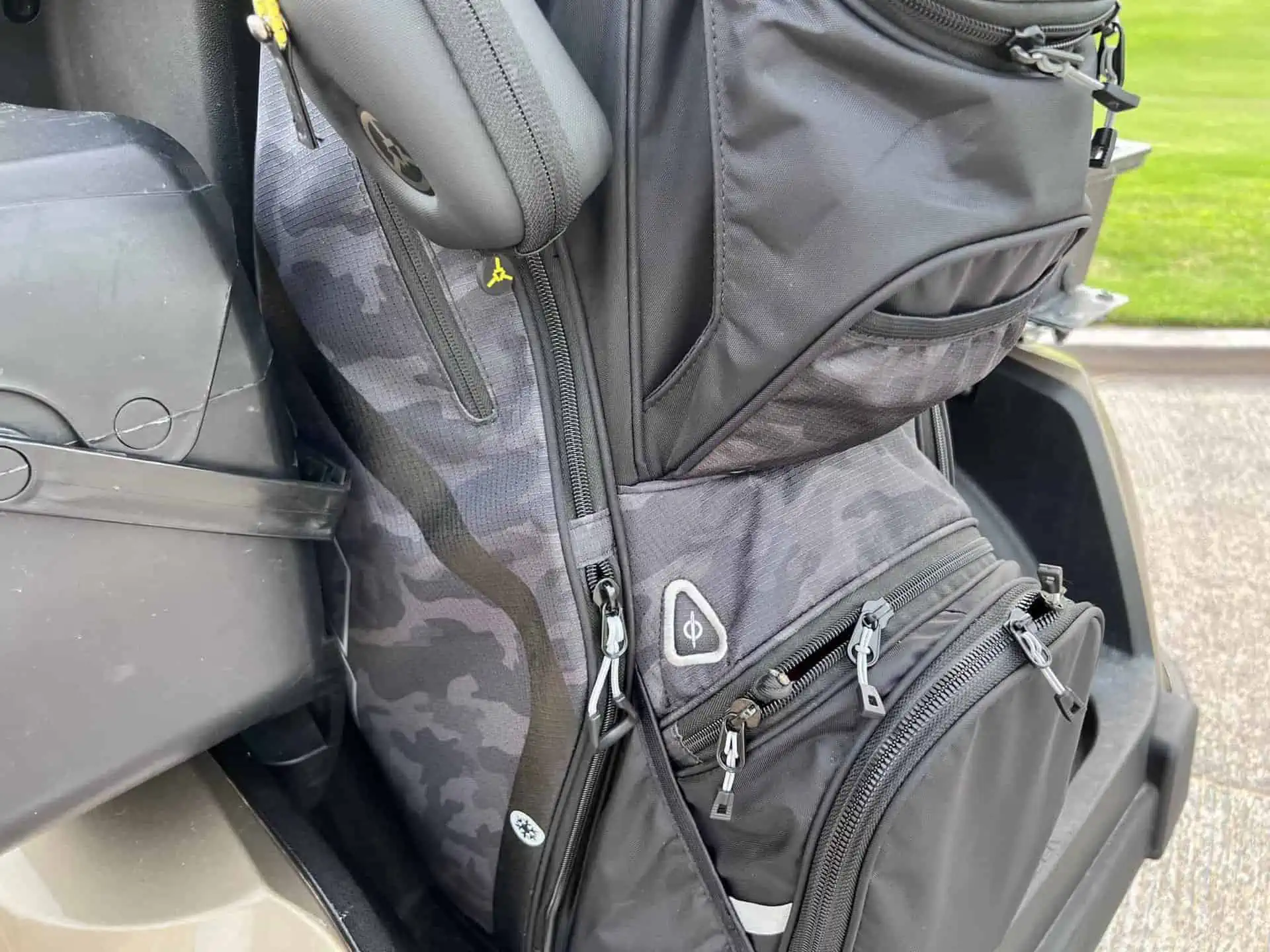 The Sun Mountain Maverick Cart Bag comes in 7 color options. The Black Camo is stealthy cool. It is subtle so that it doesn’t draw everyone’s eyes to it, but yet stylish enough for fellow golfers to mention how cool this bag looks. This color combo fits the “Maverick” name too. Weighing in around 5 1/2 lbs it is going to make moving your clubs from the trunk to the cart easier. While 2lbs might not seem like much, when you have that awkward lift from your trunk/hatch/truck bed, any weight reduction is nice on the back. (It also means don’t fill the pockets with hundreds of golf balls)
