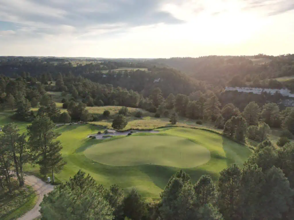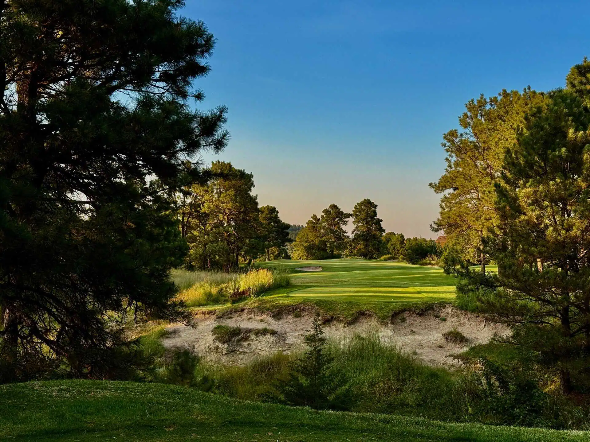 The 18the hole is a risk/reward par 5 that skirts that pines and canyon on the left and prairie on the right. Because of the dogleg shape, you can get home in 2 with well struck shots. You can show off your last birdie in front of the lodge patio. The Pines course is receptive to scoring, especially if you keep the ball in play. Every holes feels different on the course with a well routed zig-zag from prairie to pines, to canyon and back. These 18 holes feel like they offer a little bit of everything so that golfers of all skill levels can enjoy it.