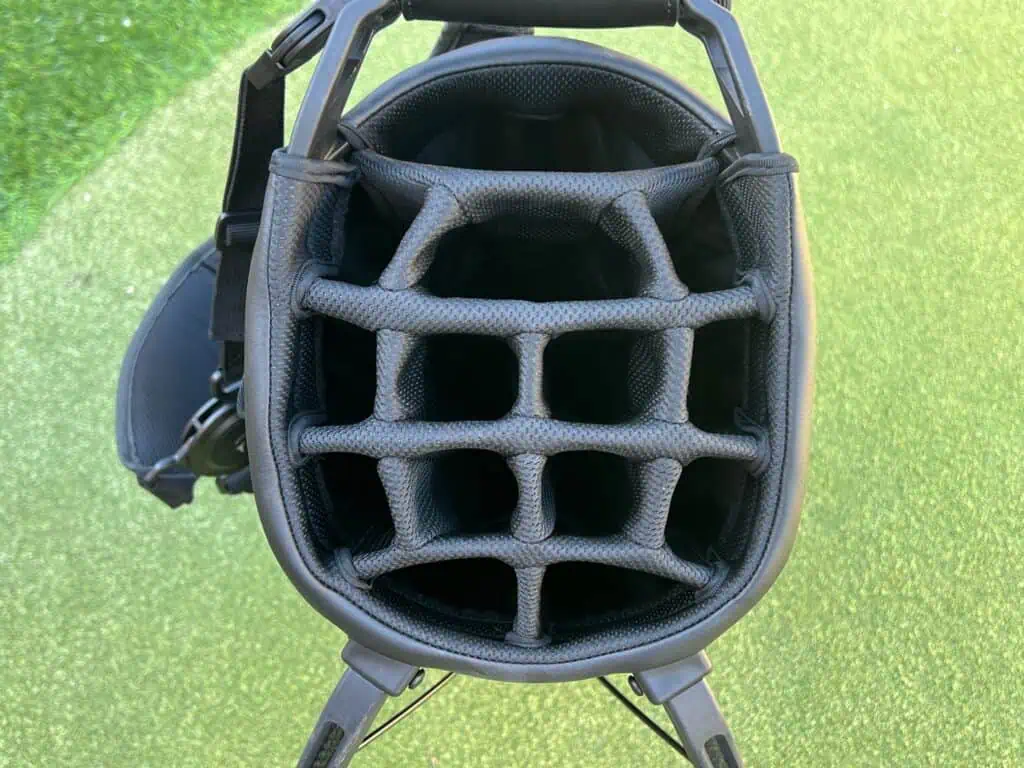 I like 14-way tops on my golf bags. I find the organization and dedicated slots match my on-course preferences. I know there are online debates between the 14-way top fans and 6-way top fans. One of the cool things about the Vessel Player Air Stand Bag is you can pick either one. They offer it with a 14-way top or 6-way top. I prefer the function of each slot in 14-way top for holding every club in place. I can quickly glance at my bag and know if I left a wedge behind or not. I know where every club goes after each shot and every club cascades nicely in “theater” like seating. There is no tangle in or out with clubs.