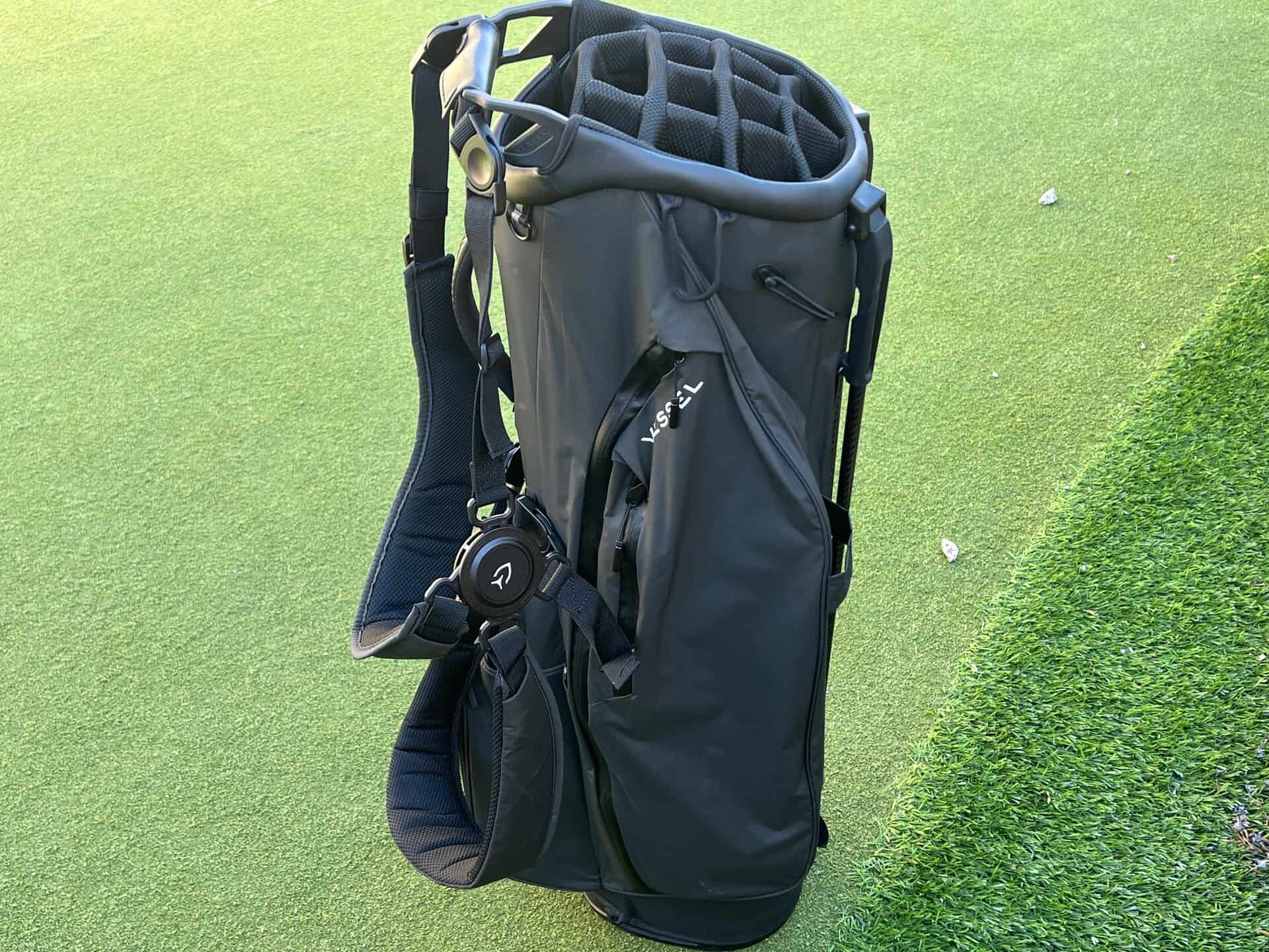 The Vessel Player Air Stand Bag is designed to be on your back. The self-balancing shoulder straps are comfortable while being lightweight. They ride very nicely on the shoulders as a backpack, but even work pretty well if you just use one strap to move the bag around. The pad on the bag is minimal, but still functions to reduce pressure on your lower back. The carbon fiber legs are strong, sturdy and deploy easily. They too are lightweight. The base is a pivot base so that your bag looks great whether it is stand straight up or tilted on the legs. It works exactly as the walking golfer wants.
